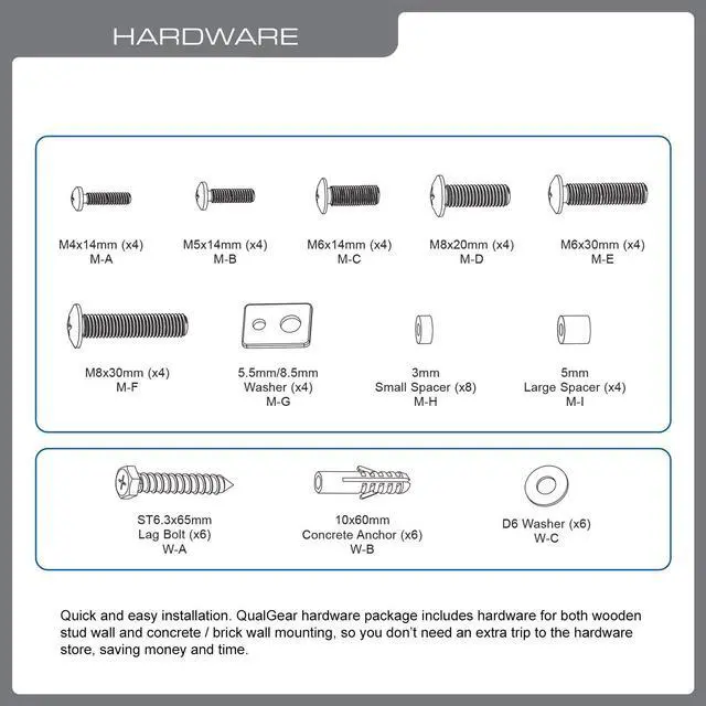 6. Mounting hardware is included for mounting to wooden studs, concrete and brick surfaces