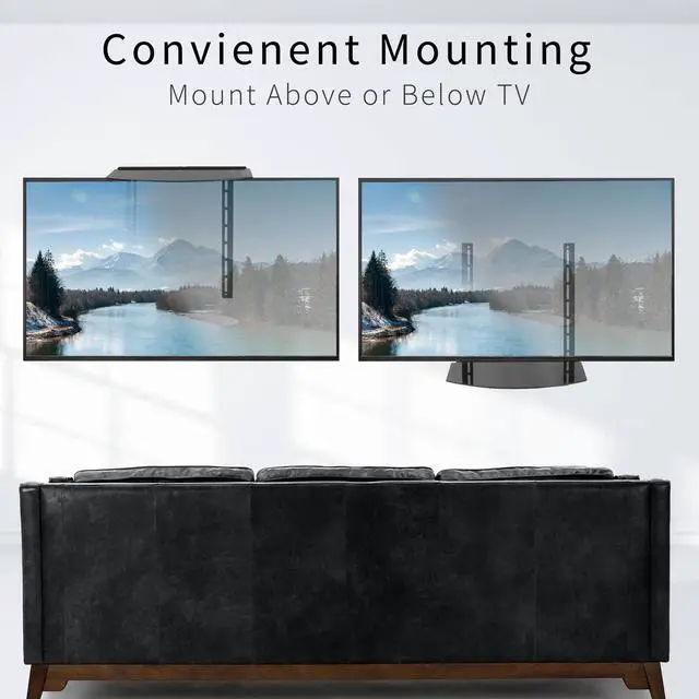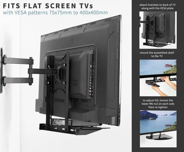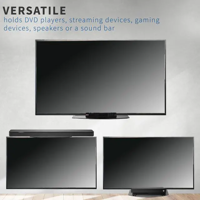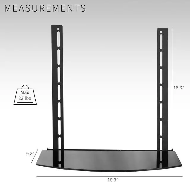 Enhance your visual display with the Under/Above TV Glass VESA Shelf (MOUNT-SF04R) from VIVO! This sleek shelving unit is a sturdy, helpful addition to your existing wall mount, creating convenient storage space under or above your flat screen TV. The tempered glass platform is capable of holding cable boxes, DVD players, stereo components, gaming systems, and more. The stand features a tilting design to accommodate a variety of screen setups and keep your items well balanced and secure. Solid steel mounting brackets support VESA patterns up to 400x400mm and easily attach between a VESA wall mount and the back of your TV, increasing the practicality of your entertainment center.