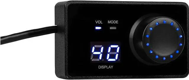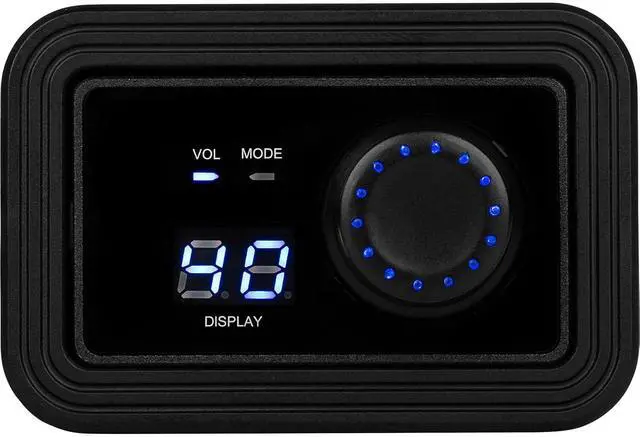 This remote features blue accent lighting around the control knob, blue-lit digital display, and a blue indicator identifying which of its two functional modes it is currently in. To switch between the two control modes, volume control and mode (preset select), simply hold down the control knob until the indicator light shifts positions.