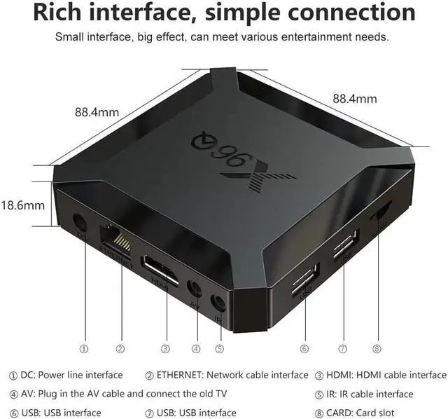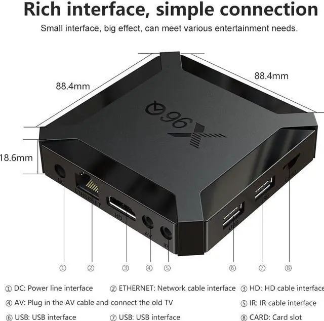 1 * HD, 1 * AV OUT, 2 * USB, 1 * IR Receiver, 1 * Ethernet Interface, 1 * TF CARD, 1 * DC Interface