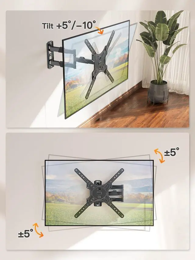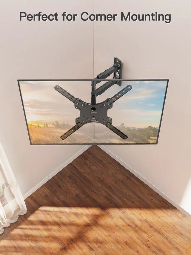 Universal TV Mount - This full motion TV mount fits most 26-60 inch TVs with vesa patterns range from 100x100mm (4x4) to 400x400mm (16x16) and holds up to 77 lbs. /35kg. Please check TV weight size vesa and input access before purchase. Optimize Viewing Experience - The single stud swivel design is great for wall corners. It gives you the maximum flexibility in positioning your TV to fit your environment for a comfortable view. The mount can swivel left or right 90° tilts up 5° tilts down 10° and has +5°/-5° screen level adjustment capability.