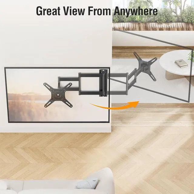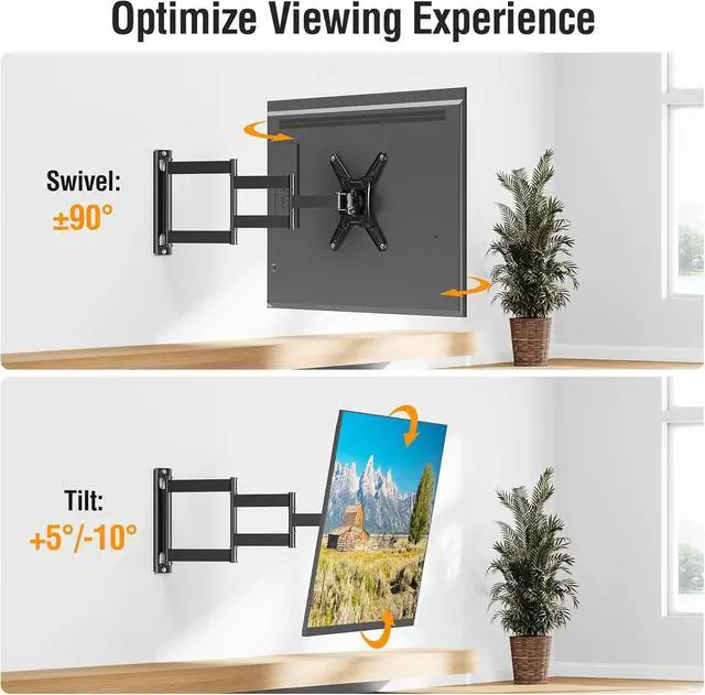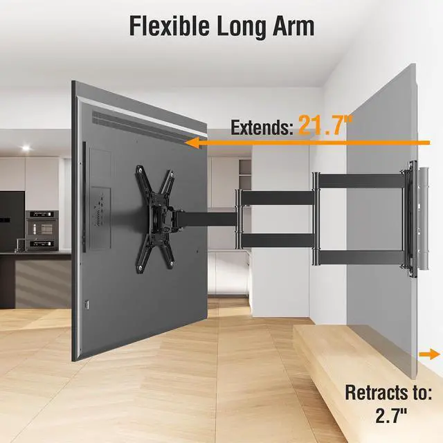 21.7 Long Extension TV Mount - This extra long arm TV wall mount can extend 21.7 from wall to cover more viewing positions. This long arm TV mount can retract 2.7 to wall for saving space and a clean look. It is an ideal choice for corner placement and you can watch TV anywhere you want. ±90° Rotation & Swivel Design - With the ±90° rotation unique design the full motion TV mount can easily display in landscape or portrait position to meet your special need. Also this swivel TV mount can swivel TV ±90° to cover any angles in your home for the ultimate viewing experience.