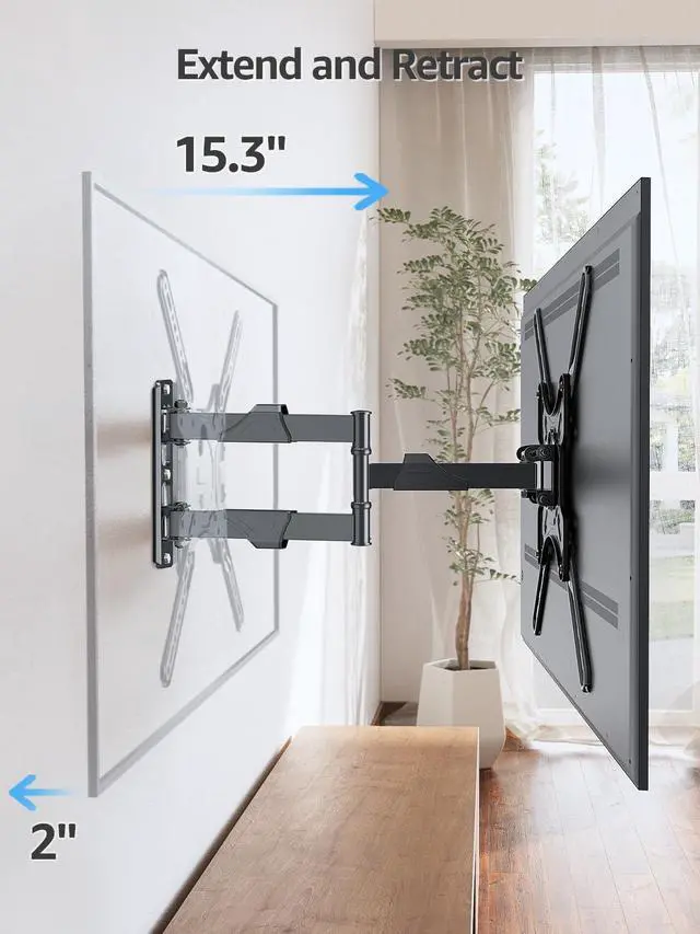 Space Design: Maintain a clean and organized entertainment setup with this TV mount. TV wall mount can extends up to 15.3 and retracts back to 2 from the wall. The wall mount also folds flat to sit flush against the wall saving valuable space. Included three cable covers can effectively conceal and organize wires keeping your space neat and orderly. Wall-mounting TV in home theater also protects family safety from TV tip-over it works perfect as corner TV mount living room bedroom kitchen studio office etcStability