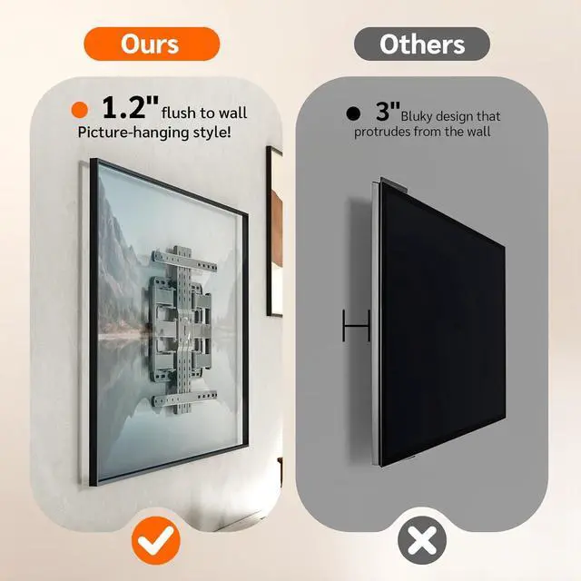 SLIM & DISCREET DESIGN: This thin tv wall mount has been cleverly designed to retract to a mere 1.2 inches from the wall ensuring a super slim profile that merges flawlessly with your living space. Its design leaves ample room for your creative home décor and with a velcro for cable management all your cables are neatly organized and hidden enhancing the neatness and elegance of your spaceSECURE