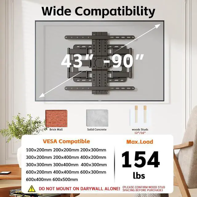 TV WALL MOUNT COMPATIBLITY: This Ultra slim TV wall mount fits for most of 43-90 inch LCD/LED/OLED TVs with VESA patterns 100x200 mm up to 600x500 mm and up to 132 lbs. Designed for installation on 12/16 wood studs concrete and brick walls. (Do not install the mount on drywall alone! ) Perfect for TV installation in living room kitchen bedroom office or any other place.
