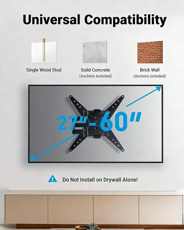 Wall Mount: PERLESMITH full motion TV wall mount fits the most of 27-60 inch flat and Curved TVs up to 77lbs. With VESA size 75*75mm to 400*400mm available and perfect center design. Compatible with wood stud concrete and brick wall mounting. Do not install the tv mount on drywall alone.