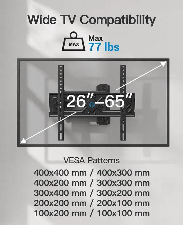 Duty TV Bracket: Pipishell Full motion TV wall mounts fit for most 26-65 TVs including all brands as long as VESA and Weight compatible(100x100mm-400x400mm Up to 77 lbs).