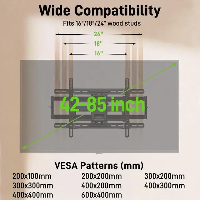 Wall Mount: XML006-24K TV wall mount fits most 42-85inch TVs with VESA sizes available from 200x100mm to 600x400mm and a Max load of 110lbs.
