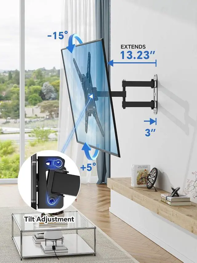 Viewing Angle: The TV mount can tilt +5°/-15° to reduce glare and rotate +/-90° to position the screen toward your location. After installation level the TV +/-4° for precise positioning. This will make your TV more flexible and provide a better viewing experienceSpace-saving design: This TV wall mount can extend 16.7 inches and retract 2.81 inches saving you valuable space and keeping your home looking clean and tidy. The single-bolt design is ideal for installation in corners or areas with only one bolt and it is ergonomically designedQuick