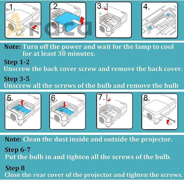 5j.j7l05.001 projector lamp- for w1070 w1080st w1080st+ w1250note- turn off the power before replacing the lamp.- clean the fan and surrounding dust before replacing the lamp to avoid abnormal KEY_TAB KEY_TAB temperature and cause the projector to malfunction.- after replacing the new lamp, clear the lamp usage time.- after turning off the projector, wait for the cooling to complete before KEY_TAB KEY_TAB unplugging the power cord.- avoid other objects blocking the projector, which will cause abnormal heat KEY_TAB KEY_TAB dissipation, so as not to affect the life of the lamp and other faults.araca bulb- perfect compatibility and stability- continuous improvement only to provide higher quality bulbs- adhere to the pursuit of high quality productsaraca's services- 30 days refund & 200 days replacement- provide technical support for projector bulbs in the first time- adhere to the pursuit of high quality