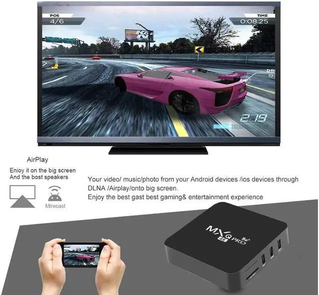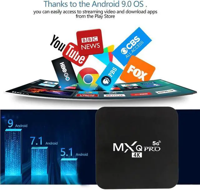 Features[Android 9.0 OS] Pro runs on the latest Android 9.0 System which is perfect in productivity, stability and performance, along with various of features and optimizations. [Amlogic S905W CPU] Powered by Amlogic S905W Quad core ARM Cortex-A53 CPU up to 1.5GHz ultra high frequency, MXQ PRO is a HD media player with Quad-Core Mali-400, up to 750MHz GPU. [ WiFi 2.4GHZ/5GHZ] Built in WiFi 2.4GHZ/5GHZ [2GB RAM and 16GB ROM] It boasts 2GB RAM and 16GB ROM, supporting TF Card Reading up to 64GB, giving you more space to store media files and to run the device more smoothly. [HEVC H.265 & VP9] H.265 decoding occupies less bandwidth (about 50%) than H.264; H.265 and VP9, powerful decoding capabilities, can decode most of the file formats at present. [2.4G Voice Remote Control] Once connected MXQ PRO Pro with your WiFi or RJ45, your HDTV becomes into a streaming machine. Voice remote control for hand free operation.What is in the package?1 x MXQ android tv box S905W 5G TV BOX1 x AC Charger1 x Cable1 x Remote Control1 x User Manual