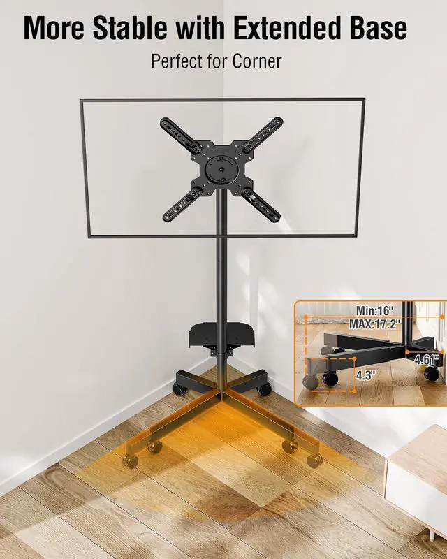 Flexible Viewing: With 5 height settings from 45.7"-48.8", the rolling TV cart can position the screen to eye level whether you're sitting or standing. The stand also tilts +8°/-2° to help reduce glare and improve your viewing experience