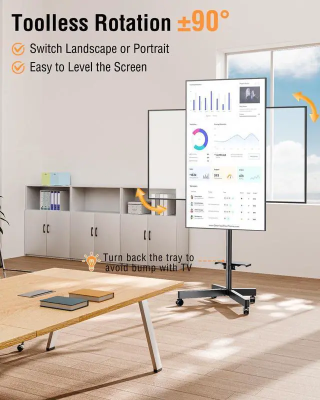 Tool-Less ±90° Rotation: Rotating TV cart can switch the TV ±90° from horizontal to vertical without tool, which helps to level the TV effortlessly and is ideal for YouTube/TikTok broadcasting, watching live streaming, online meeting, conference presentation, schoolwork, etc. Also perfect to hold Samsung Frame TVs like a picture