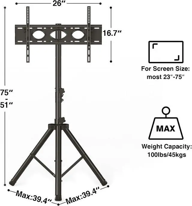 Unique Security Designed for You and Your Family : Tripod tv stand with Super Load Capacity of 100 Pounds. Compared to other portable TV stands, TAVR Furniture's TV stands are made of more durable raw materials and have been tested many times. Better quality, more reliable. Black electrostatic spraying process, frosted texture with good insulation, safe and non-conductive. By adding non-slip feet to increase friction, the stability of the TV tripod bracket is ensured while protecting the floor. The floor tv tripod stand with a safety rope in the middle to prevent the contraction angle is too small to cause the product to fall over, more secure.