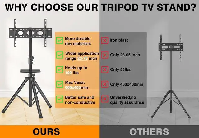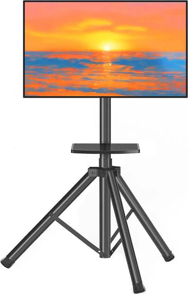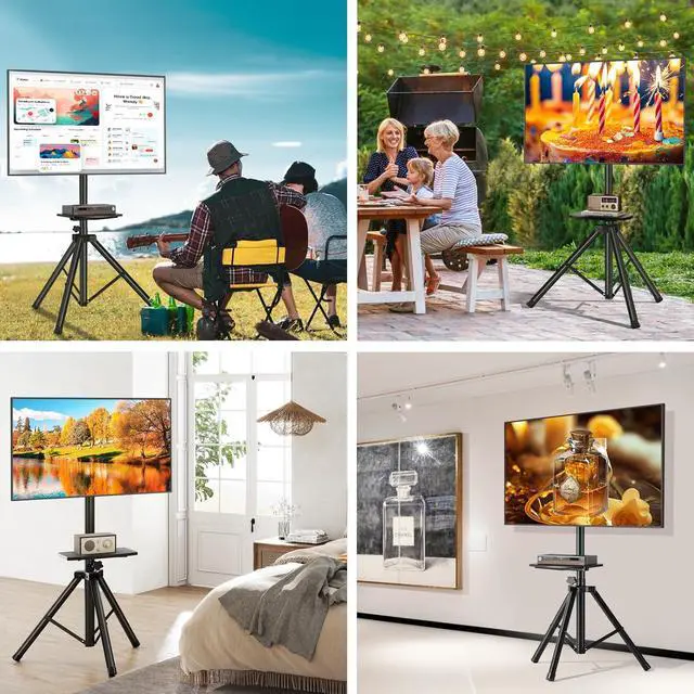Tripod TV Stand with Convenience and Portability : The portable tv stand is small when folded, and can easily fit in the trunk, perfect for outdoor use. It only takes a few seconds to set it up when you need it. Easy to take down, transport and store. You can move it to the bedroom, dining room, sports room, etc. wherever you want to put it. And it is also suitable for exhibitions, shopping malls, exhibition halls, outdoor lawns, conference rooms and other places.