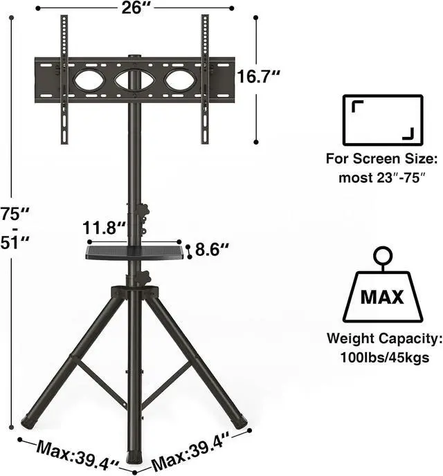 Unique Security Designed for You and Your Family : Tripod tv stand with Super Load Capacity of 100 Pounds. Compared to other portable TV stands, TAVR Furniture's TV stands are made of more durable raw materials and have been tested many times. Better quality, more reliable. Black electrostatic spraying process, frosted texture with good insulation, safe and non-conductive. By adding non-slip feet to increase friction, the stability of the TV tripod bracket is ensured while protecting the floor. The floor tv tripod stand with a safety rope in the middle to prevent the contraction angle is too small to cause the product to fall over, more secure.