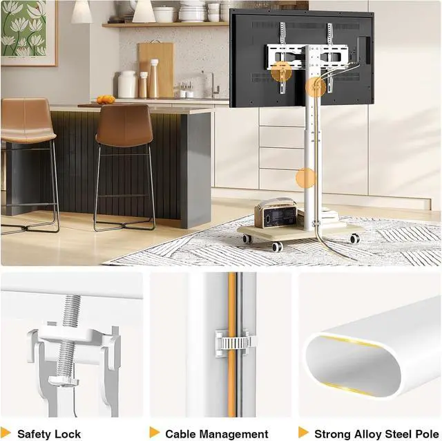 Safety Design & Heavy Structures: Consider More for Your Family and PetsMobile tv stand on wheels for bedroom with the safety lock that prevent TV from dropping. Anti-drop design on the TV mount prevent the hook from falling down due to misoperation. Unlike traditional TV stands with heavy glass bases. The wood base provides increased stability. At the same time, heavy-duty construction portable tv stand on wheels with upgrade hooks are more stable, thick and reliable.