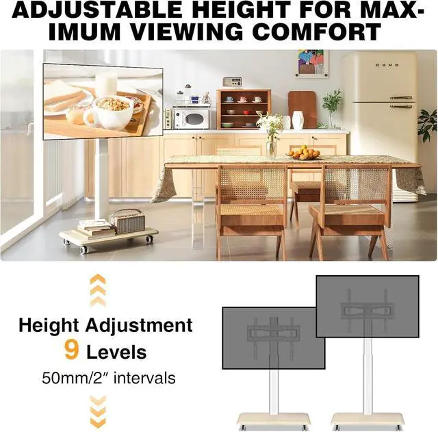 TVON Rolling TV Stand for 32 to 65 70 Inch TVs, Elegant Floor TV Stand with Wheels, Mobile TV Cart with 9 Levels of Height Adjustment for Optimal Viewing, White Floor Stand for Living Room