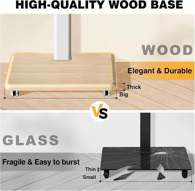 Elegant Wooden Base for Storage: Let Art into LifeUnlike other TV stands, the look of the 70 inch tv stand can completely play the role of a decorative furniture. The warm and bright wooden base and simple modern look add warmth to your home. The base with wheels is 3.2 inch in height and slides can easily into the end of your bed or behind the TV cabinet, saving aisle space. At the same time, its base can also be used to store Router, DVR, Sub, PC, PS4 etc.