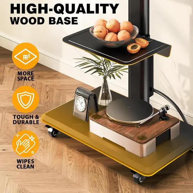 TVON Rolling TV Stand for 32 to 65 70 Inch TVs, Elegant Floor TV Stand with Wheels, Mobile TV Cart with 9 Levels of Height Adjustment (Black, Wooden Base with Power Outlet+1 Shelf)