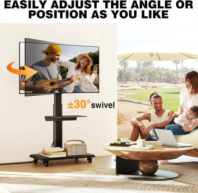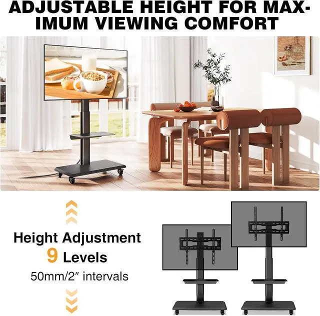 ±30° Swivel and Much More Height Options: Flexible to Meet More NeedsWhile other tv cart rolling tv stand only have 6 or less height adjustments. Our 9 levels of height adjustment is designed to meet different height of more requirements. At the same time, the portable tv stand can swivel ±30° to easily adjust for optimal viewing angle. More for you, this TV stand on wheels includes cable management to keep your equipment and accessories neat and organized.