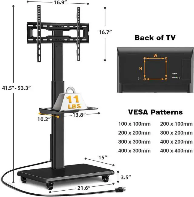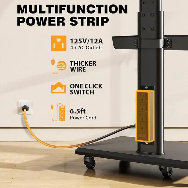 Safety Design & Heavy Structures: Consider More for Your Family and PetsMobile tv stand on wheels for bedroom with the safety lock that prevent TV from dropping. Anti-drop design on the TV mount prevent the hook from falling down due to misoperation. Unlike traditional TV stands with heavy glass bases. The wood base provides increased stability. At the same time, heavy-duty construction portable tv stand on wheels with upgrade hooks are more stable, thick and reliable.