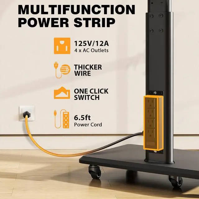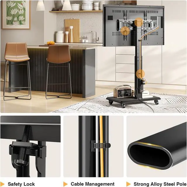 Safety Design & Heavy Structures: Consider More for Your Family and PetsMobile tv stand on wheels for bedroom with the safety lock that prevent TV from dropping. Anti-drop design on the TV mount prevent the hook from falling down due to misoperation. Unlike traditional TV stands with heavy glass bases. The wood base provides increased stability. At the same time, heavy-duty construction portable tv stand on wheels with upgrade hooks are more stable, thick and reliable.