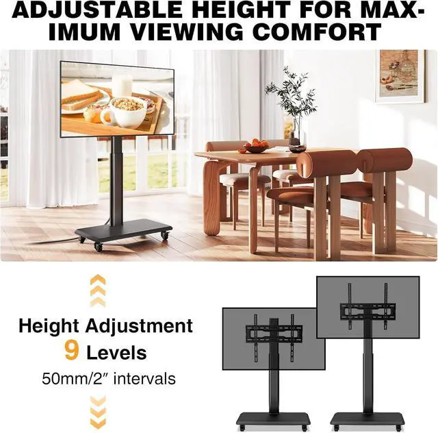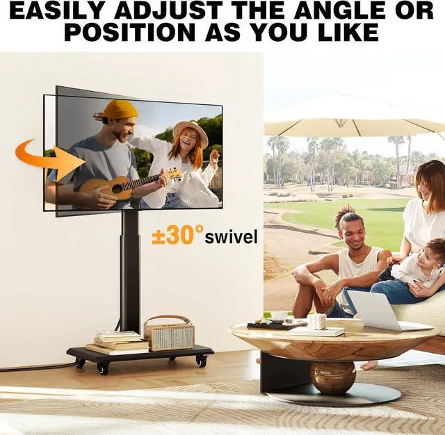 ±30° Swivel and Much More Height Options: Flexible to Meet More NeedsWhile other tv cart rolling tv stand only have 6 or less height adjustments. Our 9 levels of height adjustment is designed to meet different height of more requirements. At the same time, the portable tv stand can swivel ±30° to easily adjust for optimal viewing angle. More for you, this TV stand on wheels includes cable management to keep your equipment and accessories neat and organized.