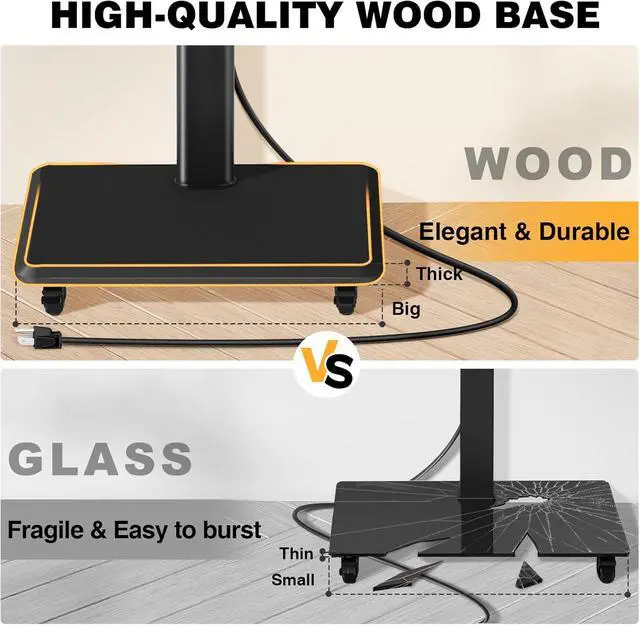 Elegant Wooden Base for Storage: Let Art into LifeUnlike other TV stands, the look of the 70 inch tv stand can completely play the role of a decorative furniture. The warm and bright wooden base and simple modern look add warmth to your home. The base with wheels is 3.2 inch in height and slides can easily into the end of your bed or behind the TV cabinet, saving aisle space. At the same time, its base can also be used to store Router, DVR, Sub, PC, PS4 etc.