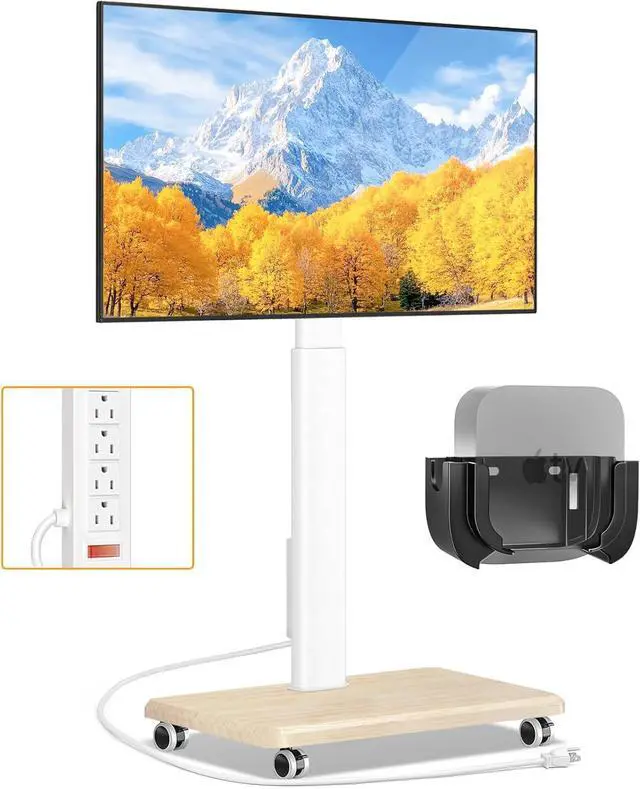 TVON Rolling TV Stand for 32 to 65 70 Inch TVs, Elegant Floor TV Stand with Wheels, Mobile TV Cart with 9 Levels of Height Adjustment (White, Wooden Base with Power Outlet)