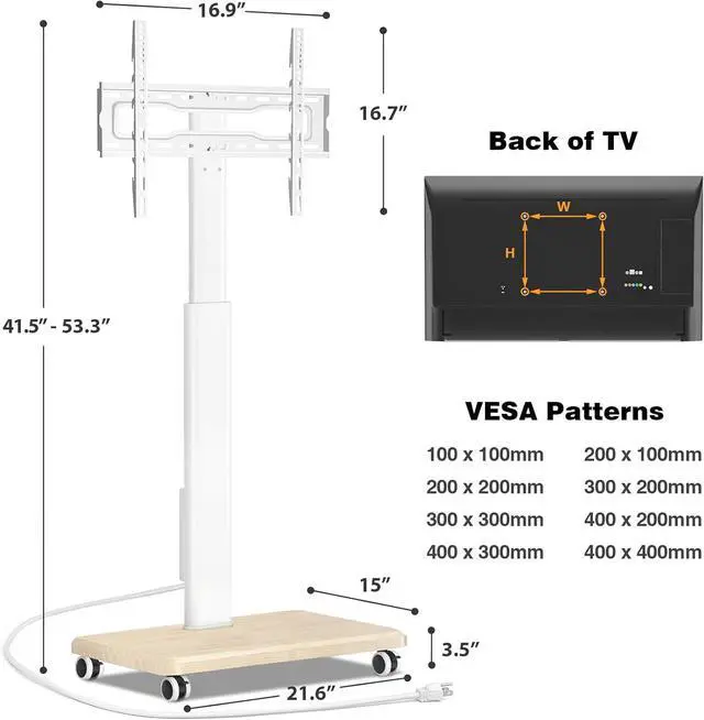 Safety Design & Heavy Structures: Consider More for Your Family and PetsMobile tv stand on wheels for bedroom with the safety lock that prevent TV from dropping. Anti-drop design on the TV mount prevent the hook from falling down due to misoperation. Unlike traditional TV stands with heavy glass bases. The wood base provides increased stability. At the same time, heavy-duty construction portable tv stand on wheels with upgrade hooks are more stable, thick and reliable.