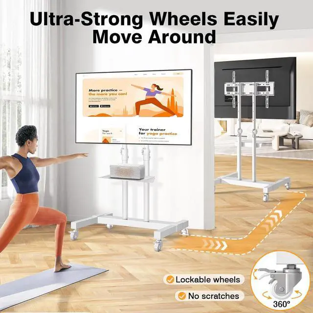 Locking Wheels : Tall tv stand wheels including 4 pieces heavy-duty 360° swivel casters. 2 pieces swivel casters with brake on front side make the TV cart rolling tv stand stationary or mobile when desired, easy to roll around, change TV's viewing angle and even to move this from room to room.