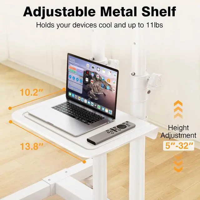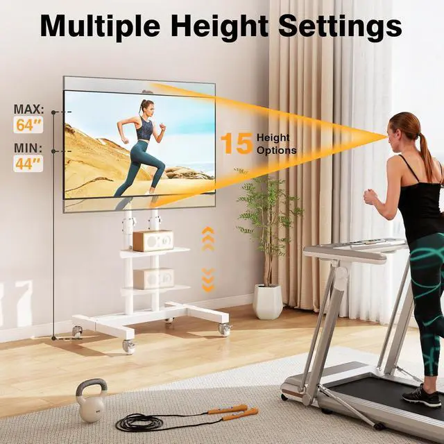 Height Adjustable : TV rolling stand has 15 steps height adjustable option, height from 44'' to 64" (The height includes the mount and hook.). Besides, portable tv stand with middle metal shelf what can be adjusted freely, offers more space to hold A/V equipment like games monitor, tablets, cable box, laptops etc.