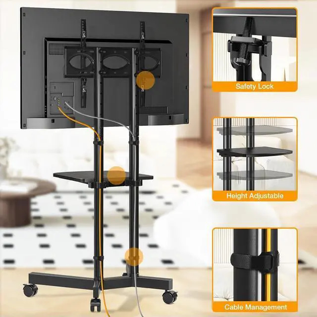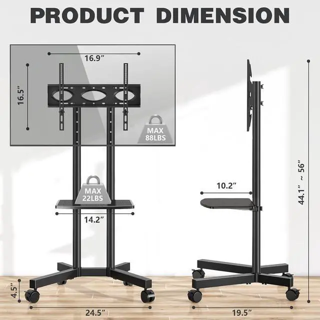 Rolling TV Stand with Heavy Duty StructureOur rolling tv stands for flat screens has commercial grade heavy duty quality, and the base is designed to save space by placing it on non-parallel walls such as corners. Suitable for commercial and residential use, Easy to assemble and install.