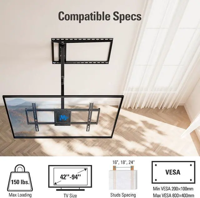 Universal TV Mount: TV wall mount fits most 32-65" TVs up to 99 LBS, with max VESA of 400mm x 400mm/16" x 16" mounting holes spacing. If your wood stud spacing exceeds 16 inches, please refer to the 16", 18", 24" wood stud full motion TV mount MD2380-24K