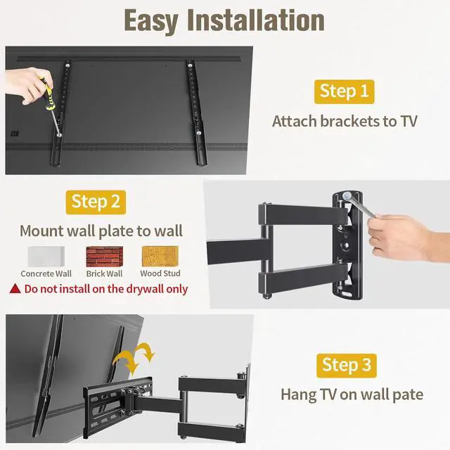 [Easy installation] TV mount with decent instruction and full range of hardware are packed in pre-labeled bags. We also offer cable ties and bubble level. Additional concrete anchors are available through Mounting Dream team(Concrete Anchor Size: 10x50mm). All our TV brackets can not be installed on drywall alone.