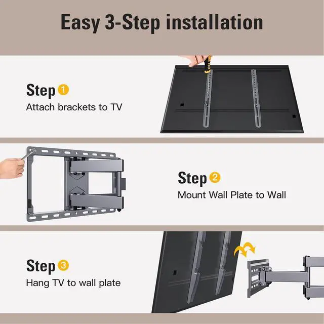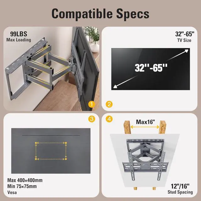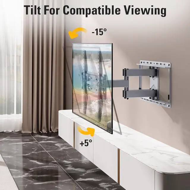 [Enhance Your View] This full motion TV mount consists of 6 articulating arms that can extend up to 16.6 inches and retract up to 2.5 inches from the wall. Viewing is more pleasant with this wall-mounted TV bracket. It increases viewing flexibility by tilting the TV up 5° and down 15° to avoid glare, and by swiveling it 45° and adjusting the level 4°.