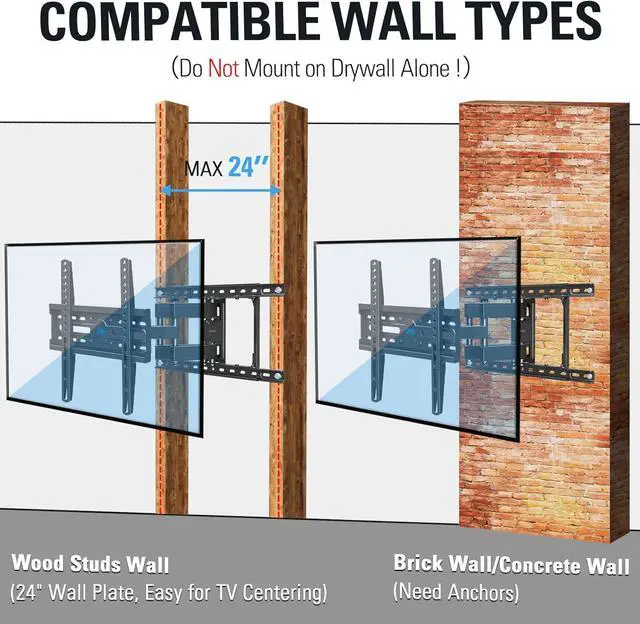 UNIVERSAL DESIGN: TV Mount fits for most 32-65 inch flat screen TV, 99 lbs. Max weight capacity with Max VESA size from 75 x 75mm to 400 x 400mm, compatible with 16", 18", 24" wood studs spacing, plus the concrete wall.