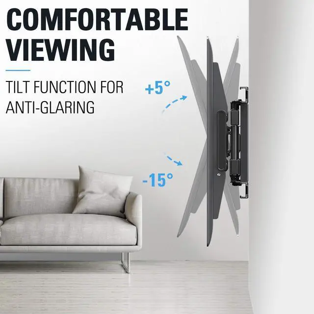 OPTIMAL VIEWING EXPERIENCE: TV wall mount with swivel and tilt, easy to tilt screen up 5° and down 15° to reduce glare, swivel TV left or right 45° for comfortable viewing angles. Supports 2.59" to 16.69" wall distance adjust flexibility. +/-4° post-installation adjustment allows perfect TV leveling
