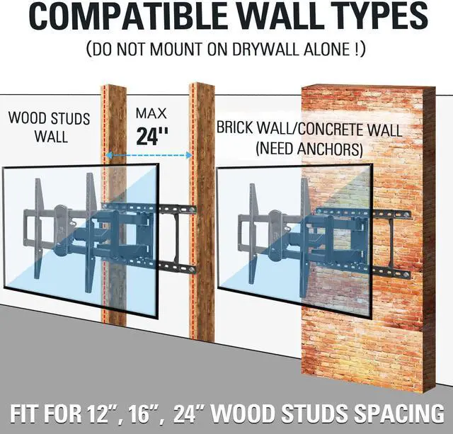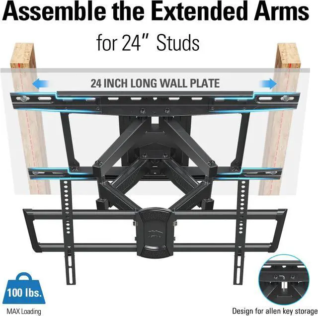 UNIVERSAL TV MOUNT: Full motion TV mount fits most 42-84 inch LCD/LED/Plasma/Curved TVs up to 100 LBS, with MAX VESA 600 x 400mm, supporting 16", 18" and 24" wood studs spacing (Require to assemble the extension arms included)