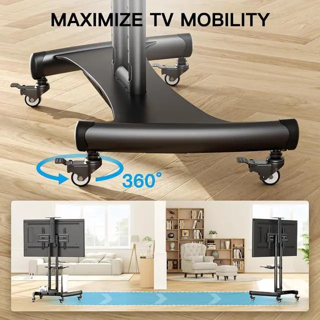 Easy to installNo drilling process is needed, rolling TV cart will eliminate the dust and noise problems, so no need to worry about disturbing the neighbors or landlord. The installation tool is included in the package. Read the manual carefully to install the TV cart successfully.
