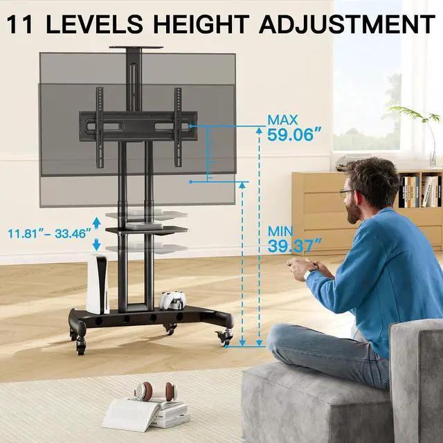 Tilt up 5° & Tilt down 10° - Maximize Your Viewing Experience This TV stand with wheels is not only a rolling TV cart but an in-home convenient TV cart. portable tv stand on wheels features Tilt up 5° & Tilt down 10° angle adjustment functions, so you can adjust the angle of the TV according to your sitting posture, in order to reduce glare and improve the viewing experience.