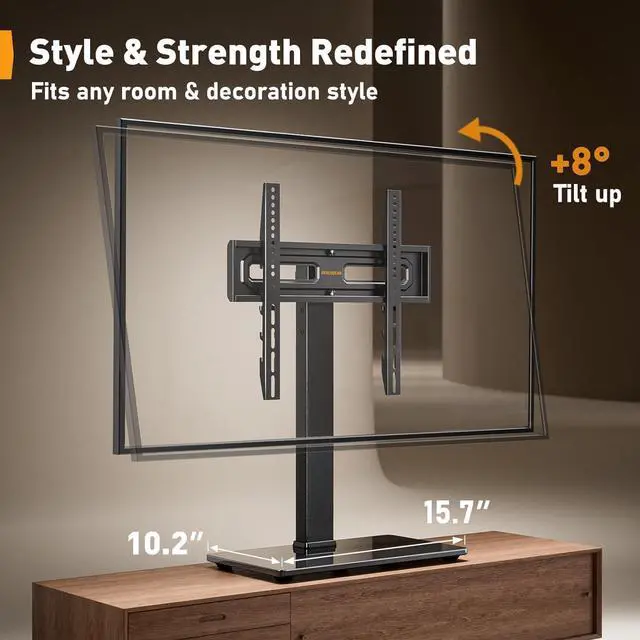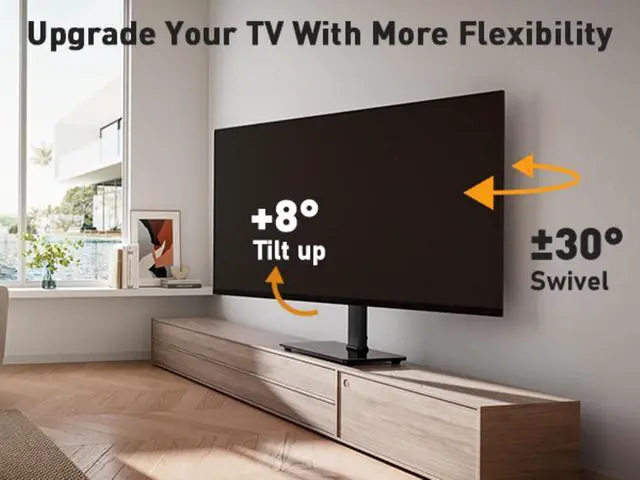 SWIVELS 60° - Maximize Your Viewing ExperienceThis universal swivel TV stand allows you to swivel your screen 30° left or right to direct the screen anywhere in the room. The TV stand mount can tilt up 8°, the perfect solution for large TVs that may slightly lean forward, making it possible for you to get an optimal viewing without being restricted by the location.