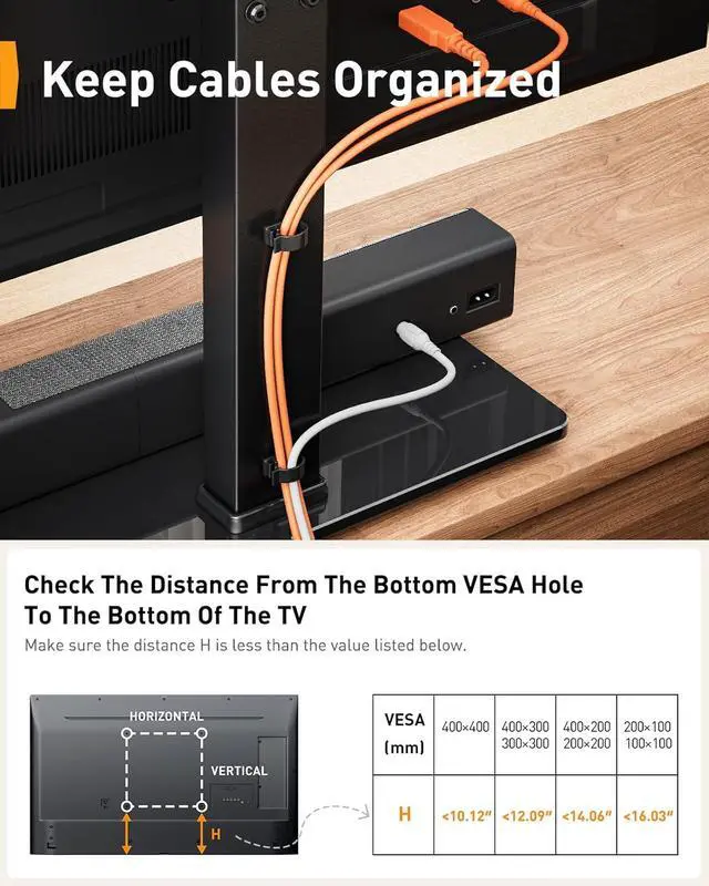 9 Levels of Height AdjustmentThe TV table stand offers 9 height configurations with 3 installation positions on the column and 3 height choices on the brackets. Holds up to 70" TVs and soundbars with a screen center height of 24.6", this will give you more space to place your cable box, DVD player, sound bar.