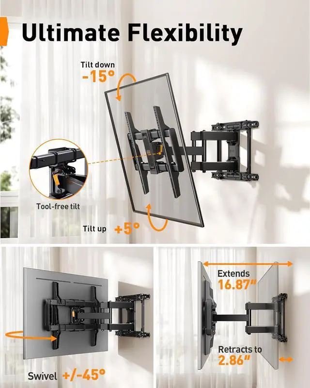 Enjoy Flexible Viewing: This full-motion TV mount provides 50% smoother movement so you can enjoy a range of flexibility without compromising stability. Tilt your TV without tools +5°/-15° to avoid glare and swivel +/-45° for a more immersive viewing experience from multiple angles.