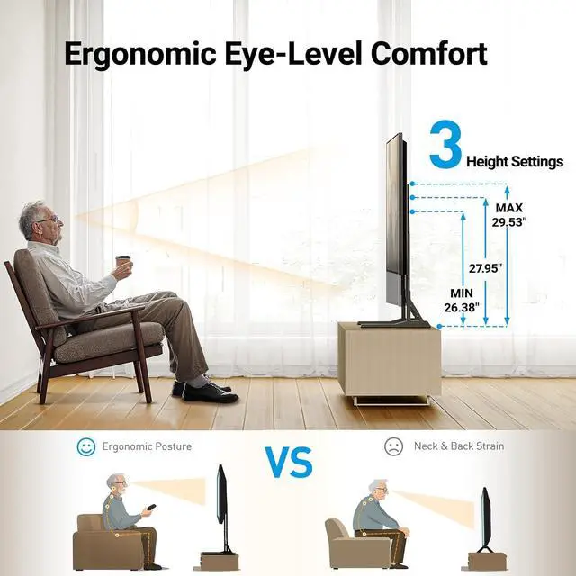 Flexible Height Adjustment Considering the comfort of eye level when watching TV, we added flexible height adjustment to this TV stand. Compared to the original TV stand, using PERLESMITH universal TV stand allows you to adjust the height upward to 27.5" or downward to 25" to match your TV size and preferred viewing height. In addition to adapting to your eye level, the middle of the universal TV stand also has enough space to place a sound bar or cable box, DVD player and other equipment.