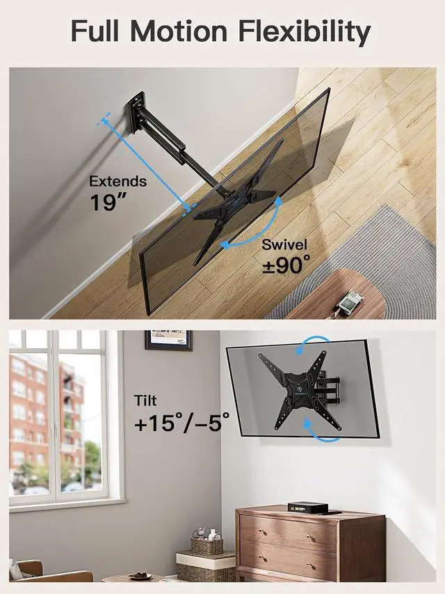 Space-Saving Design: The full motion TV mount 55 inch extends up to 19 to bring your TV closer and retracts back to 2.4 from the wall for a low-profile look. The single stud design fits awkward spaces like corners to maximize your living space, and install this swivel tv wall mount in the bedroom, home gym, kitchen, and more.