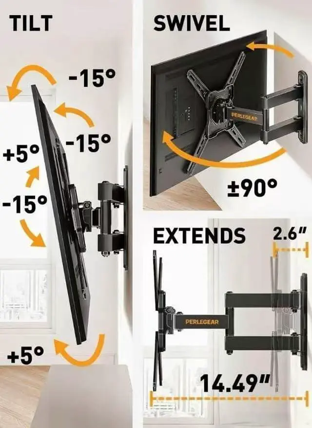 Sturdy Construction: Featuring premium heavy-duty steel and articulating arms that are thicker than other mounts, the Perlegear TV wall mount has successfully passed a rigorous 4x load test, can support up to 82 lbs. Larger TV plate and solid wall plate provide more peace of mind compared with other mounts.
