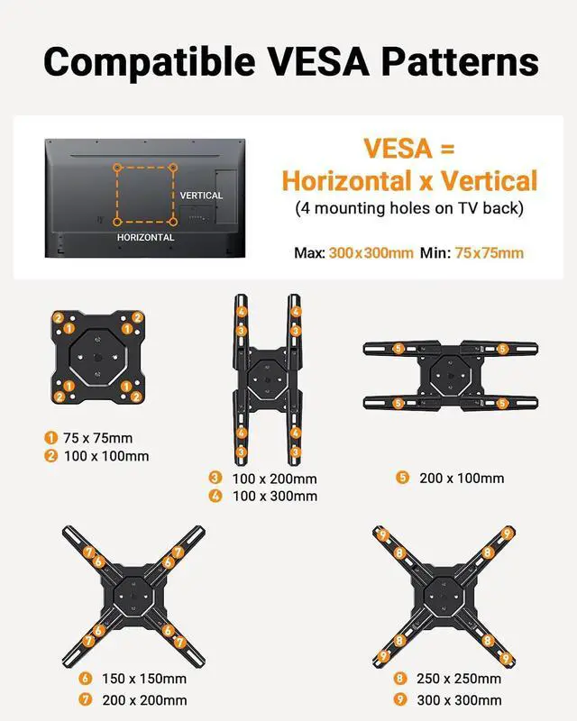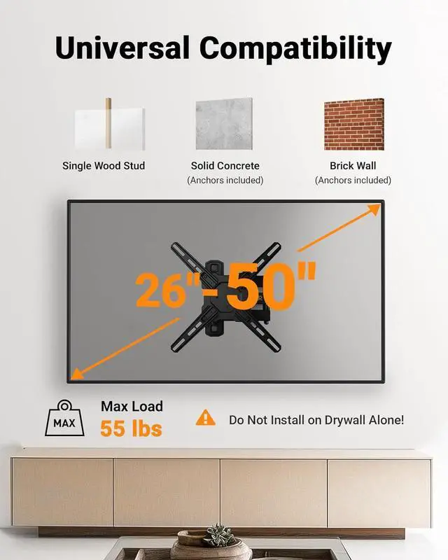 Wide Compatibility: This swivel TV mount is an ideal choice for most 26 to 65 inch flat and curved TVs with VESA patterns 100x100 to 400x400mm. Please verify the size, weight, and VESA pattern of your TV before purchase. Compatible with wood studs, concrete, and brick wall mounting.