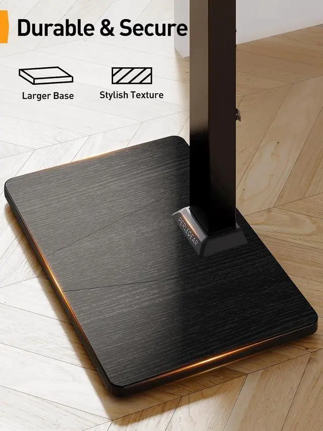 Stylish & Durable Base Our TV stands large base measures 21.65 x 15.75 to provide exceptional stability for your equipment. The floor TV stand base is made of compressed wood and finished with a modern wood grain texture to complement the décor of any living space.Moreover, our TV mount stand fits neatly behind your TV console for saving space.